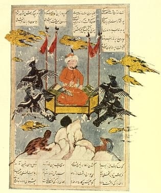 Other myths included King Kai Kawus of Persia, c. 1500 B.C., known as “the Foolish King” for his “Chariot” carried by four eagles - the legend was that the chariot crash-landed in China after the eagles grew tired. (Image from a Persian manuscript dated 1587-88 A.D., Metropolitan Museum of Art, New York.)