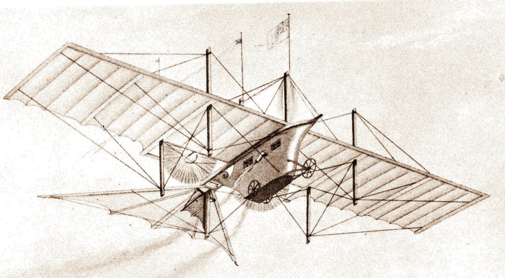 Despite a long history of failure and pivots to weaponizing, the dream of flying without fancy gases or fireworks persisted, although I wanted to share just one more example of an idea that was literally depending on hot air, or steam in this case: William S. Henson’s “Aerial Steam Carriage” - genuine historical steampunk.