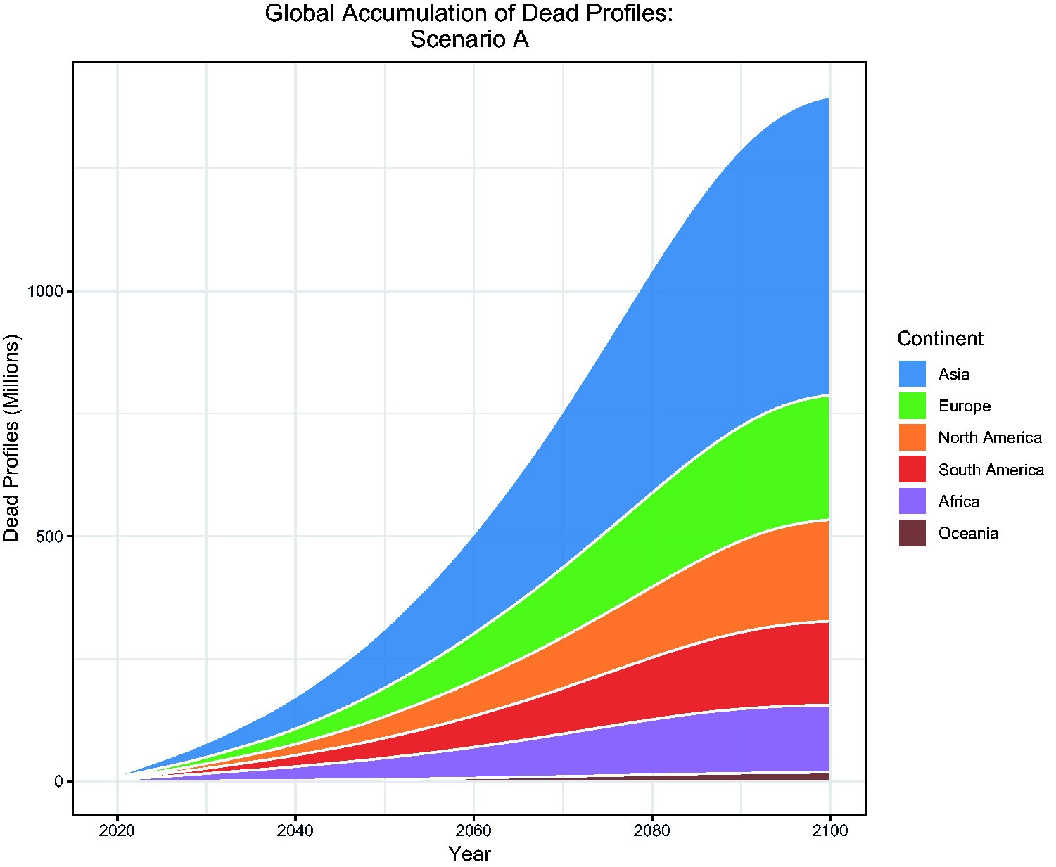 We have concluded that hundreds of millions of dead profiles will be added to the network in the next few decades alone, and that the dead may well outnumber the living before the end of the century, depending on how global user penetration rates evolve. Irrespective of how the network grows in the years to come, the vast majority of dead profiles will belong to users from non-western countries."