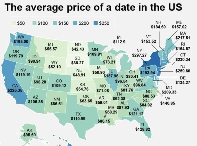 Looking at this map, I wonder what a date is like in South Dakota, it certainly seems less stressful on the pocketbook. BUT Minnesota at 109.81 is over twice the cost of neighboring Iowa (at 50.90)! Anyway, it’s clear that dating in the right and left coast is a bit pricey.