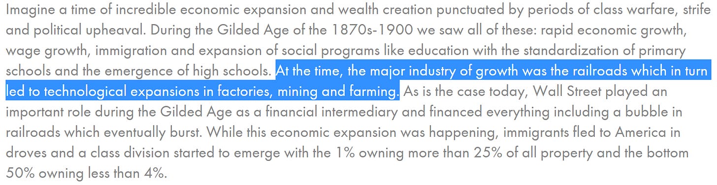 Why the comparison? Palihapitiya draws historical parallels between today’s 2020 age of disruption platforms and the Gilded Age of the railroads of the 19th century, for their economic might and transformative influence. What followed the Gilded Age was the Progressive Era which spanned the “1890s to the 1920s” and whose “main objectives … were addressing problems caused by industrialization, urbanization, immigration, and political corruption. The movement primarily targeted political machines…”