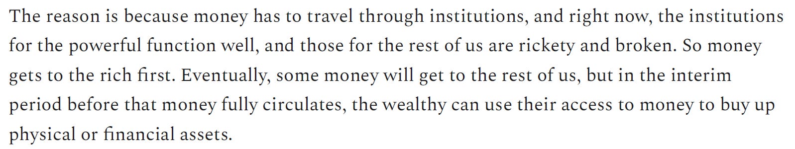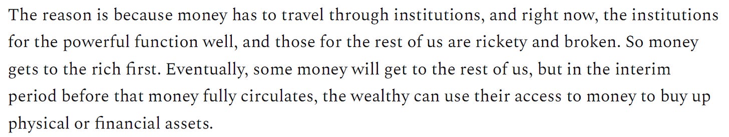 Matt Stoller’s “Big” publication focused on this in his piece, “The Cantillon Effect: Why Wall Street Gets a Bailout and You Don't”.