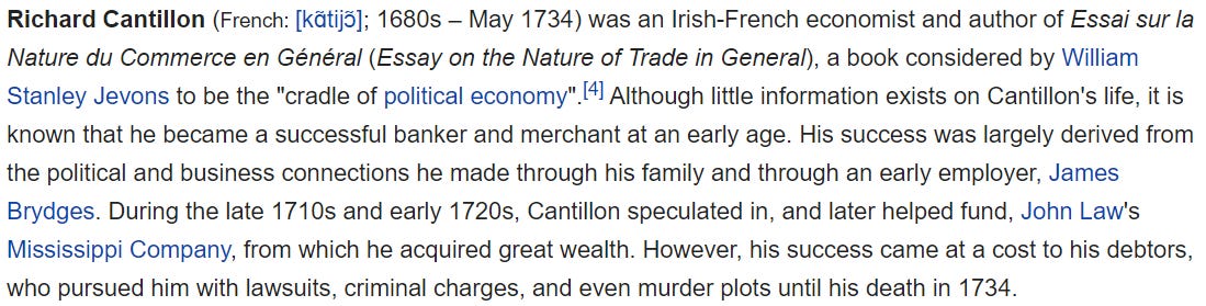 Richard Cantillon was an Irish-Frenchman who made a fortune from the infamous Missippi Company but who was best known for what the first complete essay on economics. It was published in 1755 almost 20 years after his death.